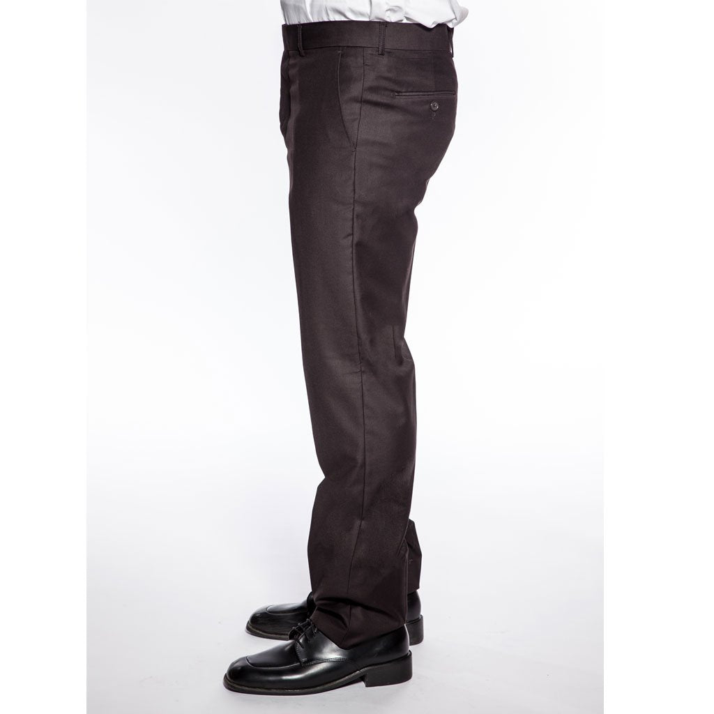 Men's chocolate brown extra slim fit skinny suit with notch lapel. This modern cut suit is made of a luxurious rayon viscose/ dacron blend fabric that looks and feels like super 100 wool. Coat has two button front closure with narrow notch lapel. Side vents. Jacket has two front flap pockets and one chest pocket. Jacket pockets are usable but come sewn shut. Gently cut open to use. Three interior pockets. Coat also features underarm sweat guards. Tetron silk lining. Very high quality and well constructed. Comes with plain-front tapered trousers. Pants are lined to the knee. Pants are a six-inch drop. Subtract six inches from your jacket size to determine your pant waist size. Meaning, if the coat size is a 40R the pants waist will be a 34R. Pants come unfinished at the bottom so that you can hem at your proper length. This suit is ideal for weddings, proms, and other formal events. Dry clean only. Please note, this is a slim fit tuxedo. It has a tighter cut, especially in the jacket. If you are in between sizes, we suggests you go with the larger size. The waist size of the pants maybe larger, but you can have those taken in easy by a tailor.
