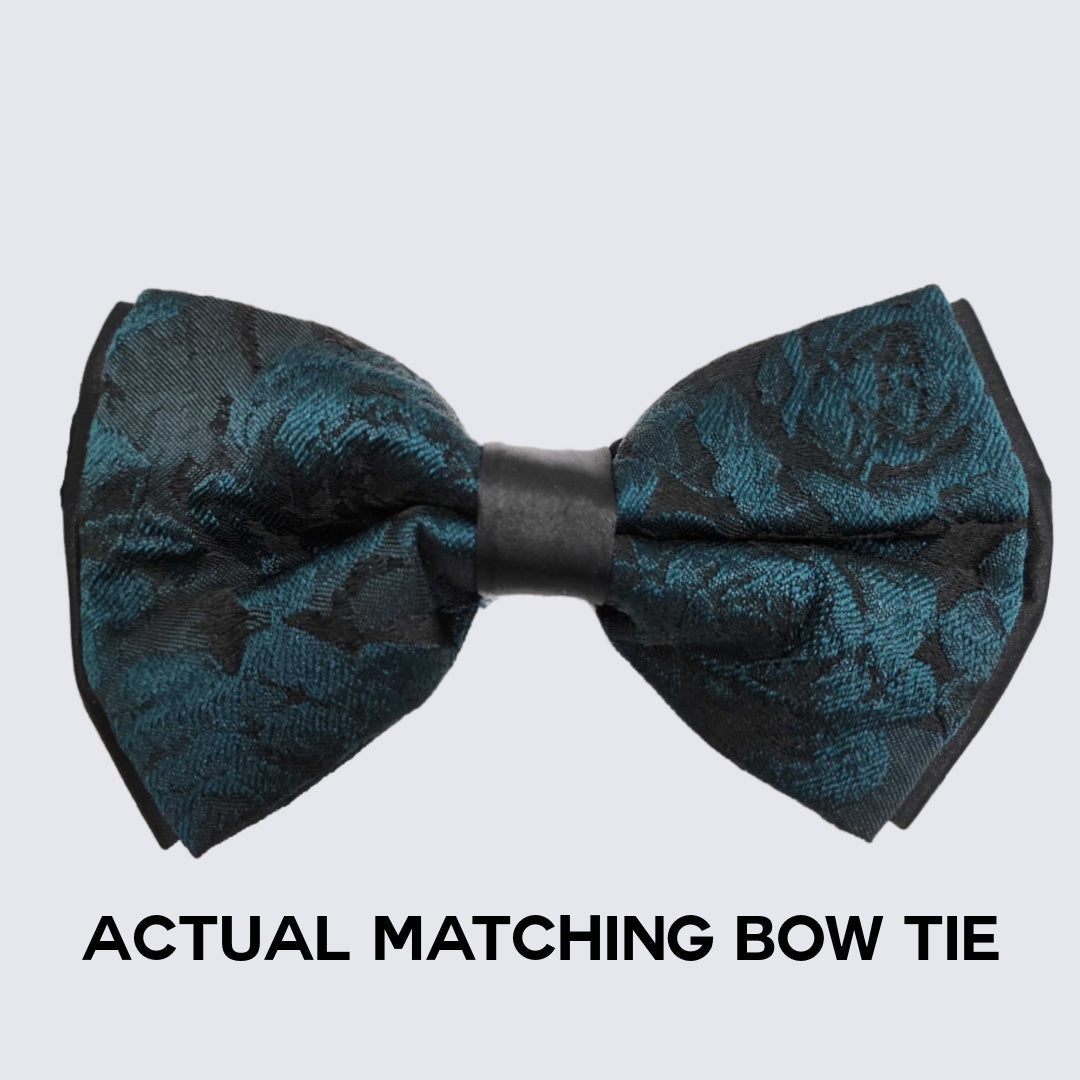 Men's hunter green slim fit tuxedo with floral design and shawl lapel. Four piece set. This fashionable tuxedo is made of a luxurious rayon viscose/ dacron blend fabric. Jacket has two front pockets . Jacket pockets are usable but come sewn shut. Gently cut open to use. Fully lined. Very high quality and well constructed. Comes with tapered trousers, jacket, and matching bow tie (comes with pattern bow tie ,not the pictured black bow tie) . Pants come unfinished at the bottom so that you can hem at your proper length. Pants are a six-inch drop. Subtract six inches from your jacket size to determine your pant waist size. Meaning, if the coat size is a 40R the pants waist will be a 34R. This tuxedo is ideal for weddings, proms, black tie, and other formal events. Dry clean only.