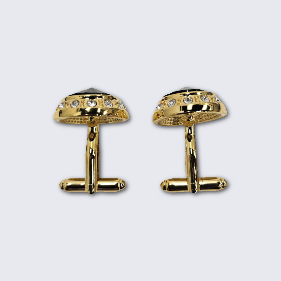 Black faceted crystal center and clear crystal rim cufflinks and studs set with gold plated metal finish. Cufflinks feature a bullet backing and studs feature a fixed backing. Comes with two cufflinks and four studs. Show your unique style and fashion with these formal sets. Cufflinks can be worn with convertible barrel cuffs or french cuff shirts. To create a more formal or stylish appearance use studs to complete your tuxedo shirt. To wear studs simply insert them into the slit above the button and use them in place of the regular button. This set comes boxed.